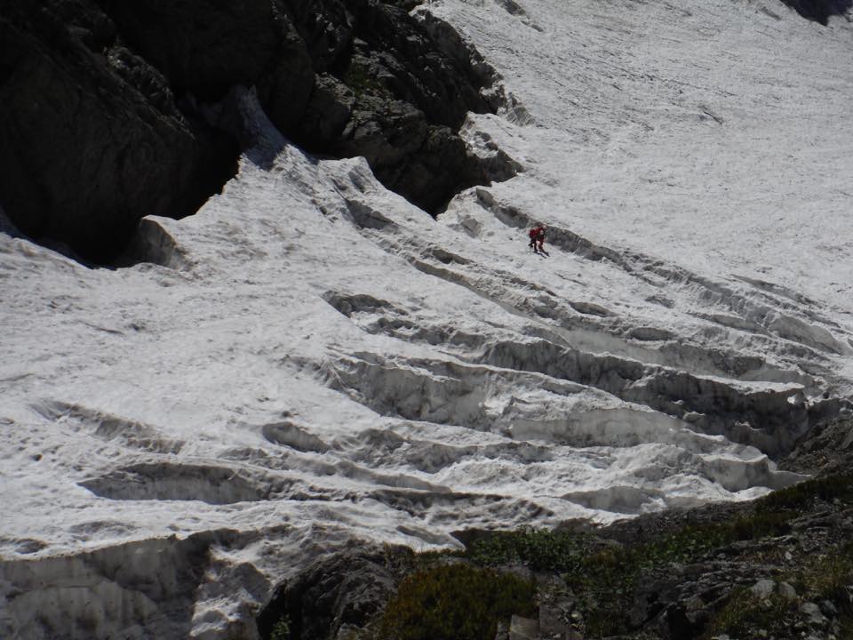 大きな割れ目ができていて、昨日は辛うじて通過可能でしたが、今後の状況次第では慎重なルートファインディングが求められます。一雨で大きく状況が変わってきますので、今後の変化には注意したいところです。