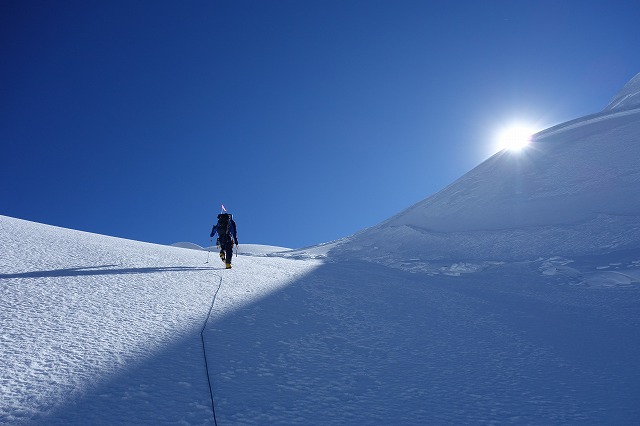 登りにさしかかり、ラッセルやクレバス越えなどが出てきました。山頂直下は急な氷雪壁になっていて、そこを登り切ると頂上でした。午前10時30分に無事に登頂しました。山頂にはランダックの時と同じく、10月上旬に登頂したシェルパチームが残したタルチョーがありました。